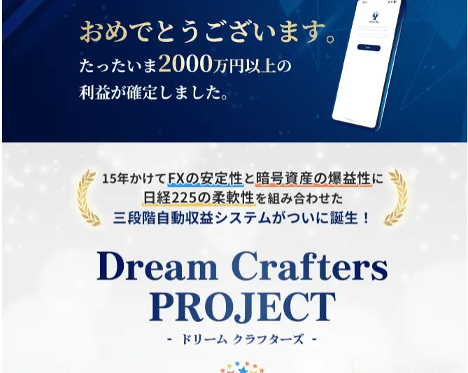 『ドリームクラフターズ(Dream Crafters) 』のプロジェクトは誰でも簡単に一万円の元手で2000万円にできると謳っていて、再現度は100%とありますが誇大広告なので心配です。100%はありえませんよね。
