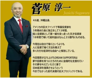 セールスページのプロフィールによると、沖縄出身の投資家とのことですね、18年間で稼いだ総利益は35億円だそうですが菅原淳一という投資家を検索しても全く情報が出てこないので架空の人物の可能性もありますので全く信用できませんね。