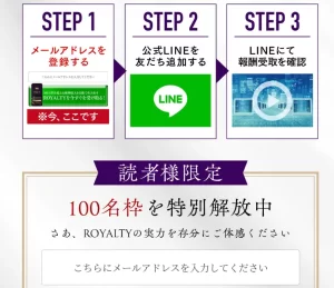 登録するとセールスページには無料でできるように見えますが、無料で稼げることはなく最終的には「ROYALTY FOUNDATION CLUB」というコミュニティの参加が必要でありコミュニティの参加は無料ではありませんでした。