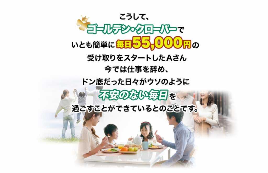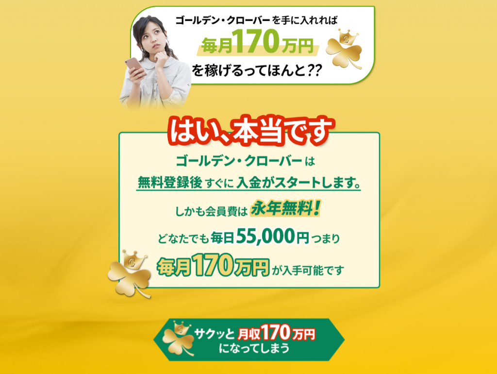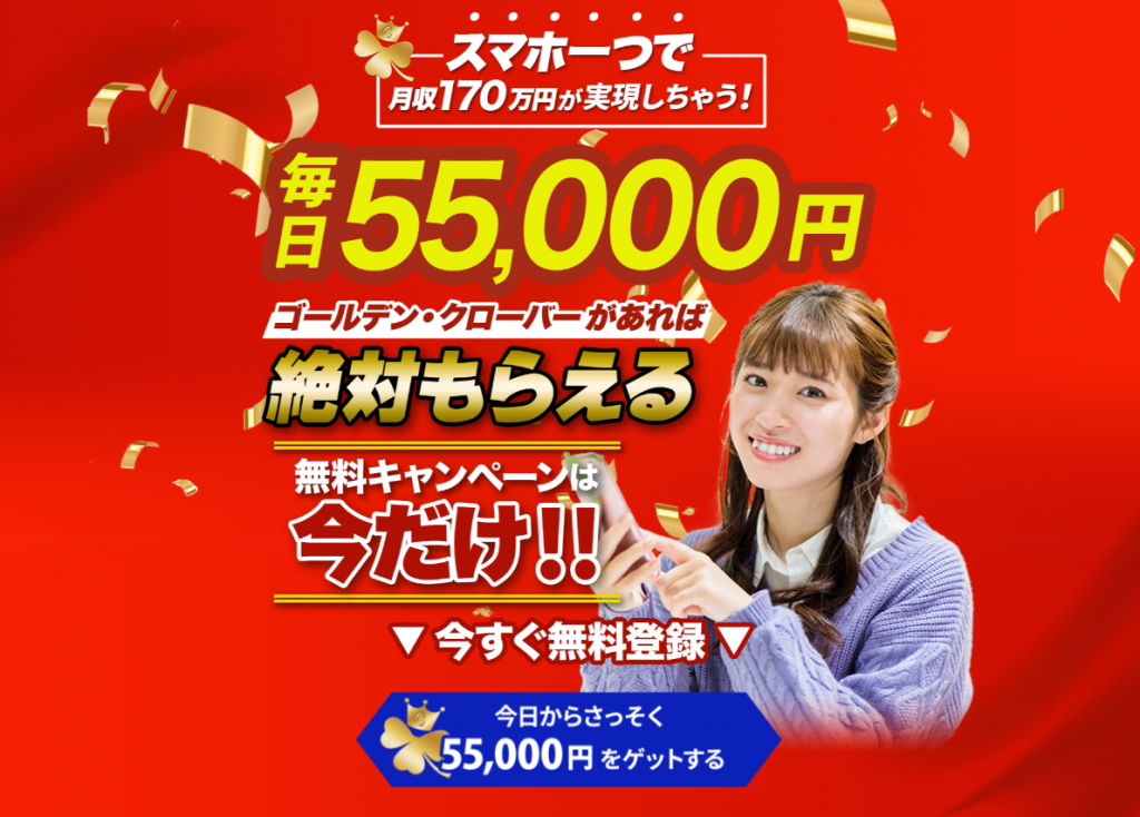 ”ゴールデン・クローバー”は、スマホひとつで毎日55,000円が絶対にもらえて、月収で170万円を実現できるみたいです。