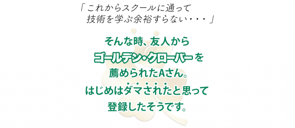 ”ゴールデン・クローバー”から紹介された案件先でユーザーがどんなトラブルに巻き込まれても登録さえさせてしまえば紹介報酬が入ってくるので詐欺まがいの案件であろうと関係なく送りつけてきます。