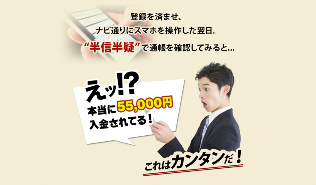お金が手に入る仕組みについてはLPからは確認することはできませんでした。ナビ通りにスマホを操作するとありますが、一体、何を行うのでしょうか?