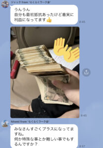 チャットになっていて自分は発言しなくてもどんどん話が進んでいき、どれだけ稼げているか札束まで出てきました(笑)