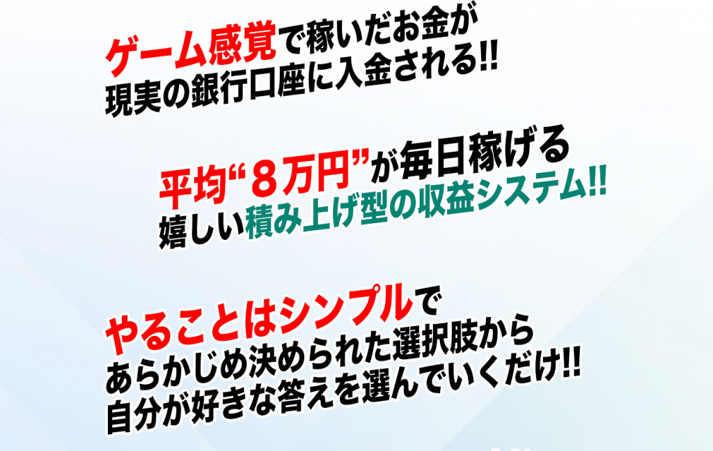 ゲーム感覚で稼いだお金が現実の銀行口座に入金され、平均”8万円”が毎日稼げる嬉しい積み上げ型に収益システムとありますが、一体どのようなことをするのでしょうか?