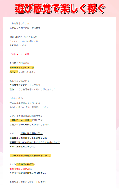 そろそろ人生をアップロードしませんか、とか、こんな仕事があっていいのか、遊び感覚で稼ぐ、とか、よくある謳い文句だらけで、LPからはどういった稼ぎ方なのかビジネスモデルはわかりませんでした。