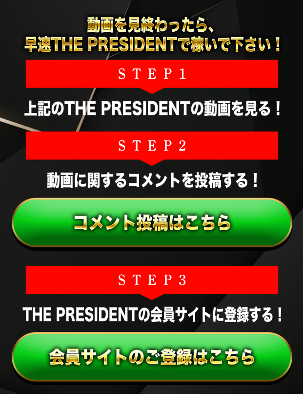 “THE PRESIDENT(ザ・プレジデント)”は以前に調査した案件のため、高額商材への誘導は間違いないでしょうから無料だからといって登録はおすすめできません!!