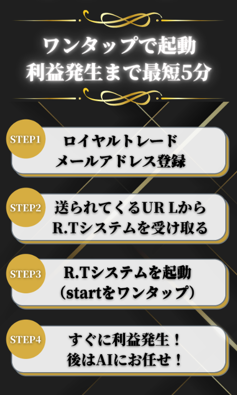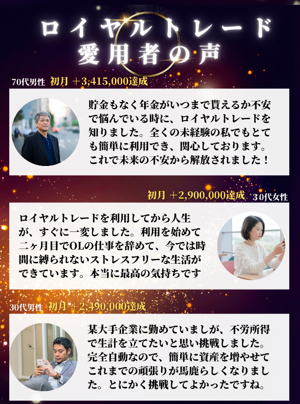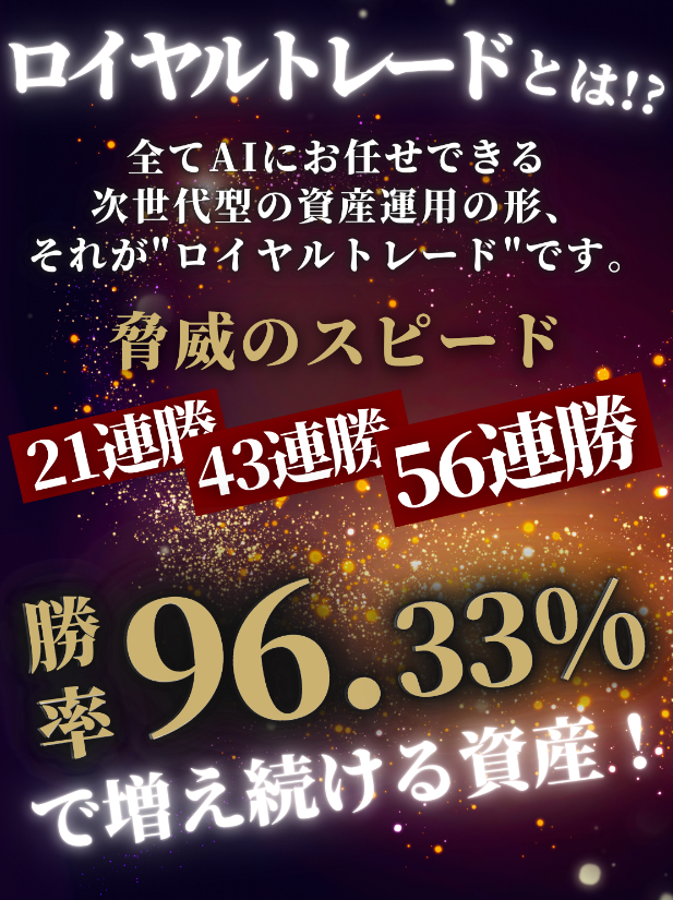 ”ロイヤルトレード”は、かつてない驚愕の勝率を実現した最強のAIシステム、次世代型の資産運用の形、それがロイヤルトレードとのことです。