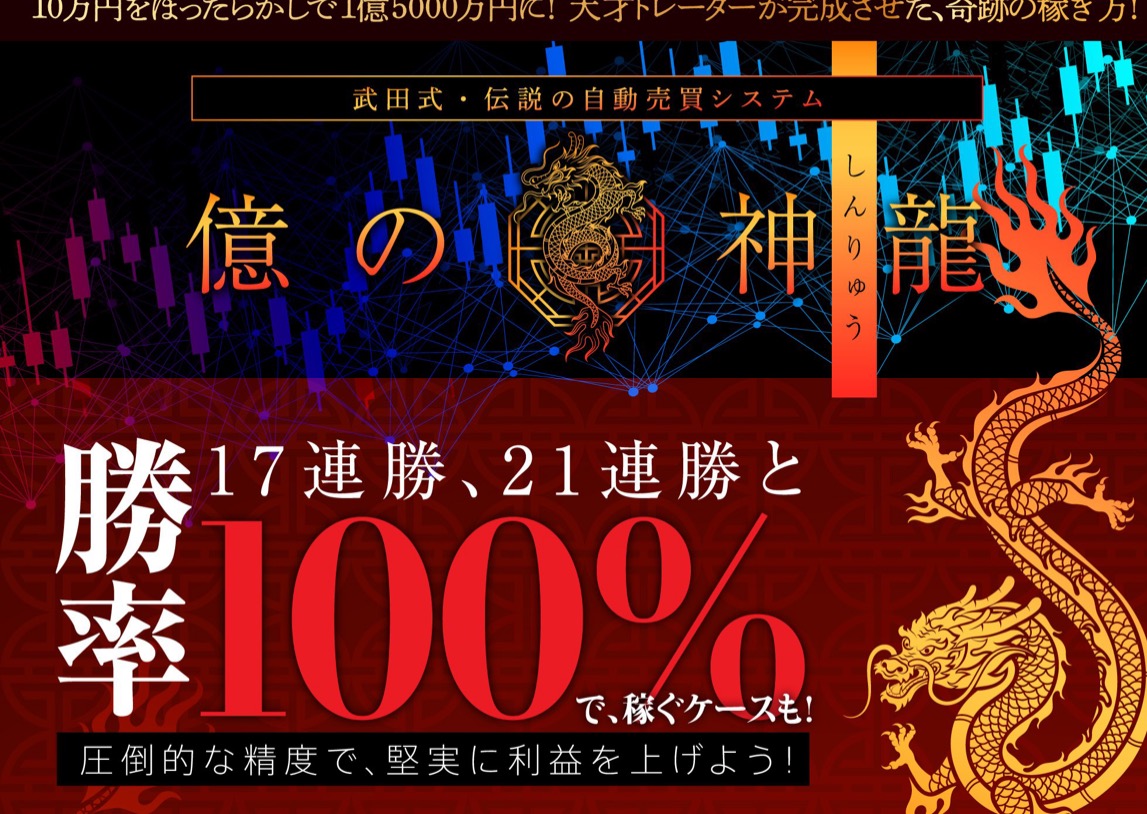 自動売買とのことなので、不労所得なのでしょうが、この「億の神龍」購入者が全員それだけ稼げればFXで挫折する方はいないですし、日本国民億万長者だらけになりますね。