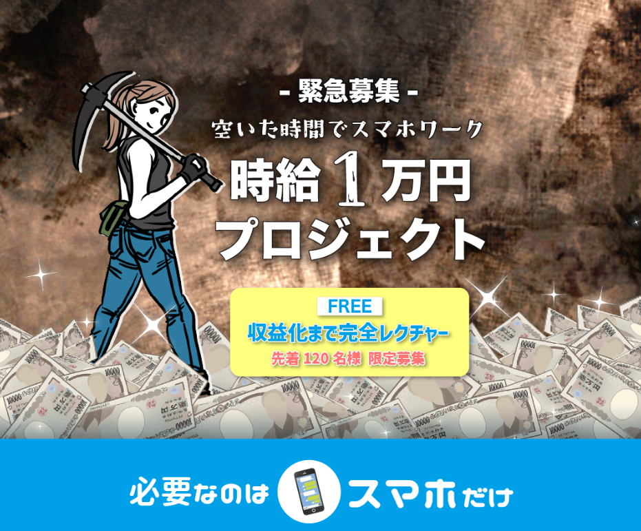 ”時給1万円プロジェクト”は、空いた時間で出来るスマホワークで、先着120名様の限定募集で収益化まで完全レクチャーしてくれる副業案件。