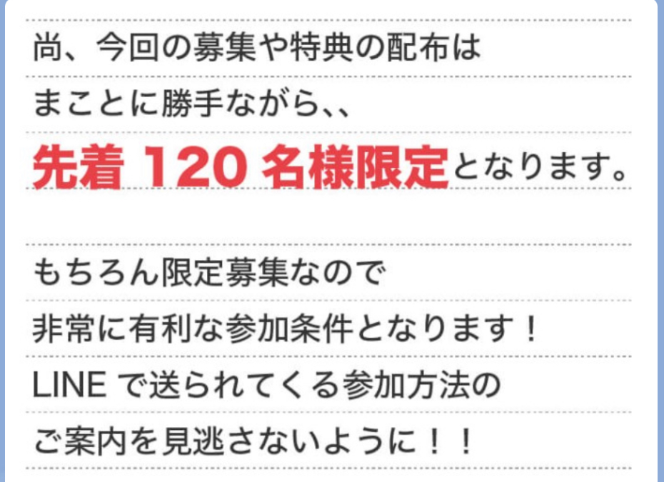 「通常29,800円のところ先着120名限定で2,000円」と謳っていますが、こういうのって大体はウソなので、焦って購入する必要はないでしょう。