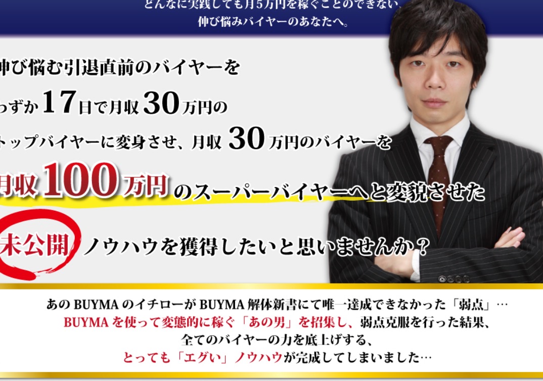 伸び悩む引退直前のバイヤーをわずか17日で月収30万円のトップバイヤーに変身させ、月収30万円のバイヤーを月収100円のスーパーバイヤーへと変 た未公開ノウハウを獲得したいと思いませんか?