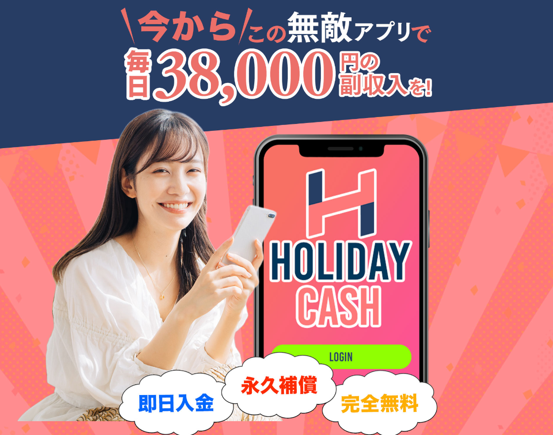 ”HOLIDAY CASH(ホリデイ キャッシュ)”は、即日入金、永久補償、完全無料の無敵のアプリで毎日38,000円の副収入が実現できるみたいです。