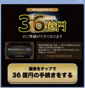 暫くすると特別役員就任祝い金として、36億円を受け取れるとのLINEが来ました。