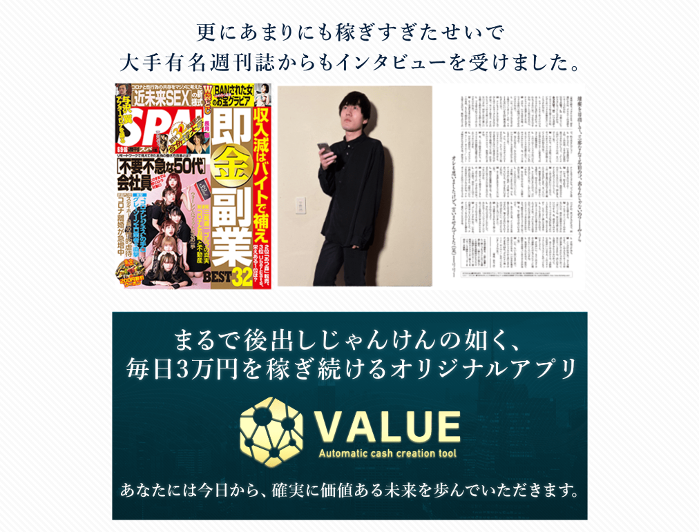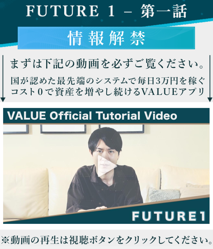 おさらいになりますが、”VALUE(バリュー)”は、国が認可した最先端システムで、アプリの通知をタップするだけで毎日、毎日、3万円が手に入るアプリでコスト0、資金0から1億円を現実するシステムです。