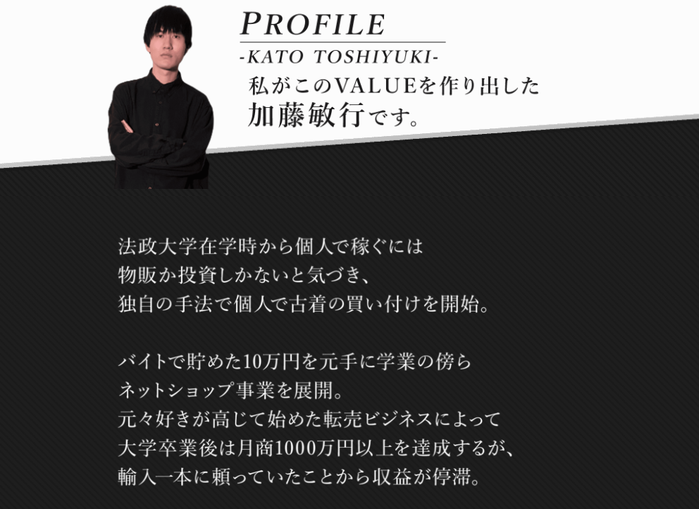 法政大学の出身の方のようですね。大学卒業後には転売ビジネスで月商1,000万円以上を達成したとのこと。