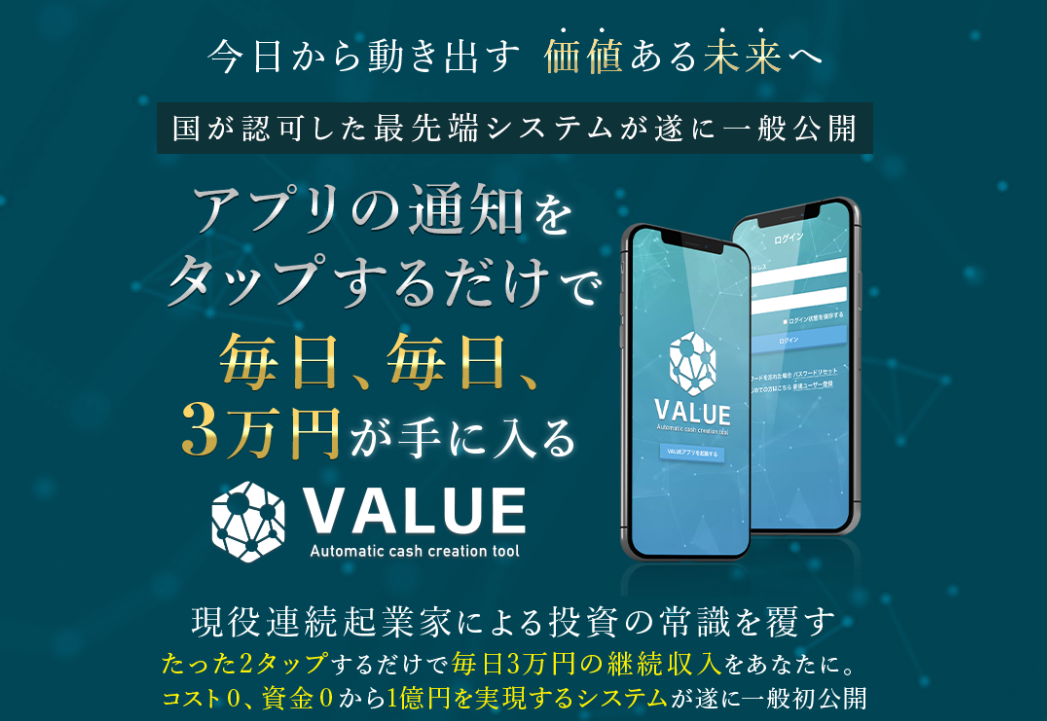 ”VALUE(バリュー)”は、国が認可した最先端システムで、アプリの通知をタップするだけで毎日、毎日、3万円が手に入るアプリでコスト0、資金0から1億円を現実するシステムとのことです。